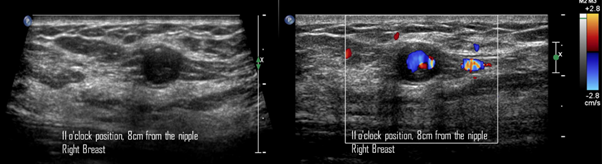 Figure 8 A) Gray-scale ultrasound image. A round, circumscribed, thin-walled nodule, with internal echoes is visualized in the right breast at 11 o'clock position, 8cm from the nipple, adjacent to the biopsy site. B) Color Doppler image. The Yin-Yang sign is present at the center of the nodule.