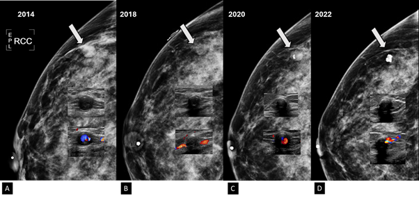49-year-old women was diagnosed with palpable and suspicious nodule of right breast. Therefore, a core needle biopsy by ultrasound-guided was performed. The pathological report reveals a benign nodule. Two days after percutaneous biopsy, she attends to our breast center due to a new and palpable nodule in the right breast. In the craniocaudal and electronical magnification projections a round, isodense and circumscribed nodule is found in the anterior third of outer quadrant of the right breast (Figure 7). By ultrasound, a round, circumscribed, thin-walled nodule, with internal echoes is visualized in the right breast at 11 o'clock position, 8cm from the nipple, adjacent to the biopsy site. Color Doppler shows the Yin-Yang sign at the center of the nodule (Figure 8). We explained to the patient about the therapeutic options and collateral effects; however, she rejected treatment for PSA. In subsequent mammography projections, the PSA starts to appear like a hypodense nodule with increased microcalcifications within it, until a microcalfication completely covers the nodule. Meanwhile, on gray-scale ultrasound images, periodically, the nodule is filled with microcalcifications. Using color Doppler, the nodule is seen with less internal vascularity until it becomes avascular. This description corresponds to a PSA with spontaneous thrombosis after 7 years of the diagnosis (Figure 9).