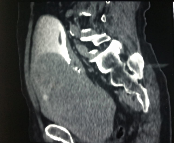 obstructive urinary symptoms, but had no hematuria or urinary incontinence. During physical evaluations, a firm prostate with an unidentified border was detected through digital rectal examination due to its sizable volume. All laboratory tests came back normal except for total prostate-specific antigen, which registered at 10.9 ng/mL. Additionally, transrectal ultrasound measured the volume of the patient's prostate to be 250 mL. During the ultrasonography examination, a large prostatic mass was identified by the radiologist. This mass had caused displacement of the bladder towards its right side. Additionally, confirmation from the CT-scan revealed that indeed it was originating from prostate tissue (Figures 1 and 2).