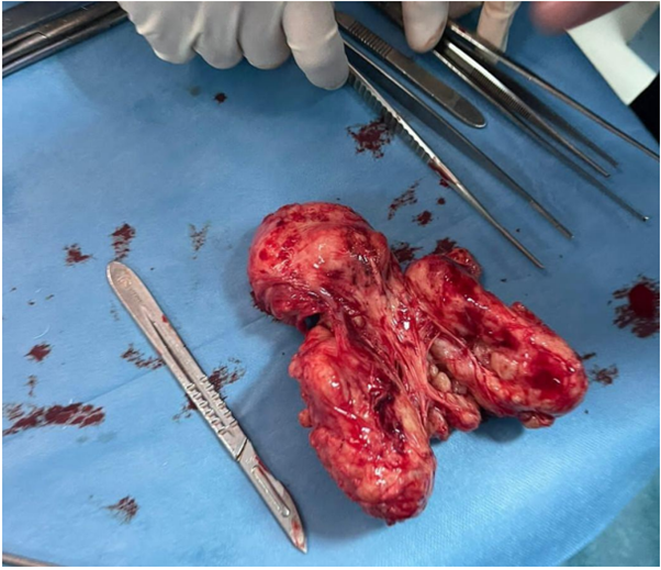 After removal, the specimen was found to weigh 570g (Figure 3). BPH with chronic inflammation was confirmed through pathological examinations. The catheter was taken out a week later and the patient successfully voided shortly after. Upon follow-up six months later, there were no reports of discomfort during urination or urinary incontinence from the patient.
