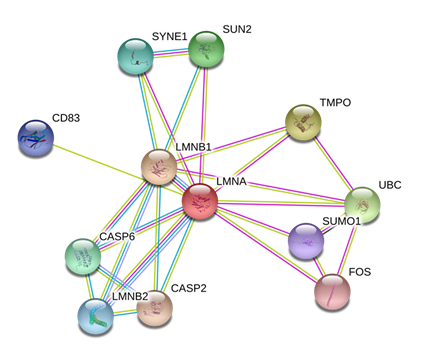 Genetic analysis has not detected LMNA mutation in our patient. All exons and their flanking regions as well as 5’-and 3’-untranslated regions were covered by the panel. Of interest, that Gersak et al.,6 reported sporadic case of DCM and hypogonadism in family from Slovenia. They described female patient with typical clinical features for Malouf syndrome: small chin, bilateral blepharoptosis, long digits and hypothyroidism. Nevertheless, no pathogenic mutations in LMNA gene have been found as well. Together with our patient it is the second reported case of sporadic DCM-HH associated with thyroid dysfunction; familial DCM-HH with thyroid hemiagenesis was first reported by Gursoy et al.7 It can be assumed that these patients form a new genotypic cluster distinct from laminopathies but nevertheless phenotypically overlapping with Malouf syndrome. The molecular etiology remains unknown in other indicated cases.1,2,7,8 Detection of such clinical cases indicates other genetic involvement in the pathogenesis of the Malouf syndrome. The term laminopathies defines a group of diseases associated with mutations in the genes coding for lamins, proteins associated with their post-translational processing, or proteins interacting with the lamins. Lamins and their partners are essential for chromatin organization, DNA replication, epigenetics, transcription, cell cycle regulation, cell development and differentiation, nuclear migration, and apoptosis.9 There are many functional and structural protein-partners of lamin A/C,10 some of them are included in the gene network (Figure 3). So molecular changes caused by mutation in partners will launch a major pathogenetic mechanism manifested in similar phenotype. We analyzed our patient for 46 genes associated with DCM. The sequencing panel consisted of sarcomere protein genes, nuclear lamin, ion channel, desmosomal and other genes. The lamin partner genes were not included. The tangled web of mutual protein-protein relations is an obstacle hindering explanation of the mechanisms underlying the development of laminopathies and other orphan diseases. Comprehension of all molecular connections is still a great challenge.