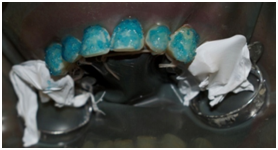 A 37% phosphoric acid etching gel was applied for 30seconds, as the preparation was within enamel (Figure 8), then rinsed off with water and dried until getting a frosty white appearance (Figure 9). Adhesive agent was applied and photopolymerized (Figure 10).