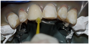 Thus, the internal veneer surfaces looked clear and had similar appearance of etched enamel. Then, the silane coupling agent was applied followed by the five-second evaporation of its solvents and activated by hot air. Just before placing the veneers, a bonding agent was applied without photo polymerization (Figure 7).