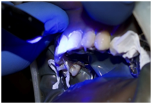 Light curing composite resin is the cement of choice. As it has a longer working time than dual cure or chemically cured composite, it offers sufficient time to remove excesses before curing. This facilitates the finishing procedures.2 Moreover, light curing composite has no amines. This is critical to final color restoration stability.14 Due care must be paid to the follow up recalls to determine the longevity of the restorations.