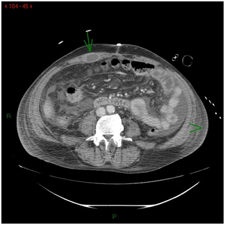 Brain scan showed a 9x6mm hypodense nodular lesion with peripheral rim enhancement in the cerebellar vermis that was consistent with an abscess. A small degree regression of the lung abscess was observed; and two abscesses (diameter of 47 and 48mm) in the right and left trapezius were seen on CT-thorax scan. CT-abdomen scan revealed little quantity of free intraperitoneal liquid, and two abscesses (23x14 and 20x20mm) in the right rectus and the right gluteus (Figure 3). Echocardiography was normal.