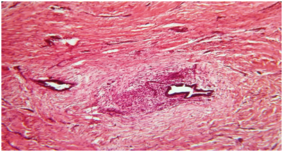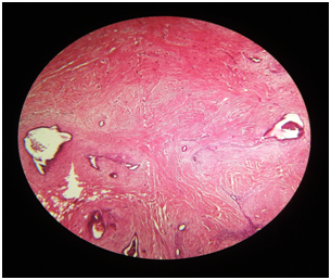 28 years old P2L2female patient reported to Gynecology department with a painful swelling at left angle of previous LSCS pfannenstiel scar for 6 years. She delivered her first Full term Alive and Healthy baby by LSCS 6 years back. She first felt pain at operated site 3 months after the surgery. It was cyclic and used to subside without any treatment. About 3 years back, she again conceived and delivered Full term, Alive and Healthy baby by LSCS. Now she presents with a tender swelling measuring 4x3x2cm at left angle of healed pfannenstiel scar. It was well circumscribed, firm and situated in subcutaneous plane. Rest of her systemic examination, vital parameters, laboratory investigations and sonographic examination were unremarkable without any evidence of pelvic endometriosios (Figure 1). Ultrasonogram (USG) of swelling showed well defined lesion measuring 2.6x1.5.x.15cm in left pelvic region at the pfannenstiel scar site which was predominantly hypoechoic with areas of hyeprechogenecity within. Based on USG findings along with clinical history, a diagnosis of Scar endomerisois was made. Patient was taken up for wide local excision of swelling with surrounding margins of 1 cm. Gross examination of excised tissue revealed irregular, grayish black fibro fatty mass with areas of congestion and hemorrhage. Histopathology examination revealed endometrial glands surrounded by endometrial stroma, embedded in fibro collagenous tissue and hemosiderin pigment at places without any evidence of malignancy (Figure 2). All histopathology findings were consistent with Scar endometriosis. On follow up period for 6 months, she did not report for any recurrence of swelling and was completely relived of her cyclic symptoms.