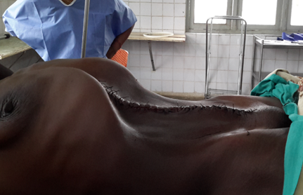 After obtaining a multidisciplinary consultation, a laparotomy under general anesthesia was decided. The patient was operated on with an informed consent. The patient was placed in supine position. The midline incision laparotomy from the xiphoid up to the suprapubic region was performed to allow wide exposure of the large mass. Intraoperatively, there was a large cystic mass. No adhesion was observed. Delicate extirpation of the mass after having removed all the ovarian parenchyma (Figure 2a & b). A left salpingo-oophorectomy and a wedge resection of the right ovary were performed without any hemodynamic and cardiac disturbance (Figure 3a & b), and the cystic mass was resected in total. It measured about 65 × 55 × 34 cm and weighed 24.73 kg (Figure 4a & b). The abdominal wall reconstruction was closed in layers (Figure 5).