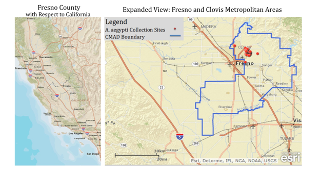 Figure 1 Sites within Fresno County where A. aegypti have been isolated January 1, 2014-December 31, 2014, consolidated mosquito abatement district (CMAD).