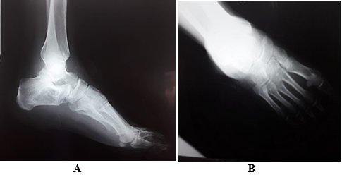 Physical exploration: There were no constitutional symptoms of tuberculosis, the left foot with increased volume at the level of the lateral malleolus and heel, pain, decreased ankle mobility in flexion and extension, injury to the external aspect of the ankle.