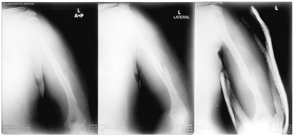 From the test, we found that instead of fracture on humerus, the diagnosis of the patient is closed-pathological fracture of left humerus due to primary bone tumor of left shaft humerus suspect malignant with differential diagnosis Ewing Sarcoma. After the diagnosis and amputation, patient was treated with chemotherapy due to pleural effusion and metastasis, however the patient could not continue second procedure of chemotherapy as the patient died before the procedure.