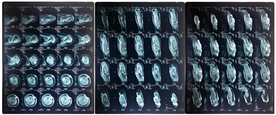 One month afterwards, swellings and pain was increased in intensity so the suspicion changed into compartment syndrome. Therefore, fasciotomy was done and histopathological examination was used to diagnose with suspicion of small round cell. Patient then was referred to Rumah Sakit Persahabatan for work up diagnostic. After MRI examination, histopathological result, and clinico pathological conference (CPC), patient was diagnosed with Ewing’s sarcoma on upper left arm. On November 2018, patient were finally undergone forequarter amputation surgery. Decrease of weight also being reported. When physical examination conducted for the first time, all signs were normal, except the appearance of mass and wound without active bleeding on posterolateral side of upper left arm with limited ROM on left elbow, wrist, and thumb. Mass was palpable with diameter of 32cm (contralateral diameter 17cm), hypoesthesia on radial, and VAS level 4-5. Histopathological anatomy shown appearance of small blue tumor cells. The clinical presentation, laboratory result, and MRI result were shown on Table 1 and Figure 1-3.