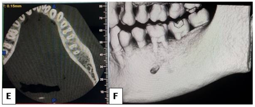A 21 year old medically fit male patient visited our dental department with a chief complaint of a decayed tooth in relation to the lower left back tooth region since 6 months. Patient gave a history of pain in relation to the same on biting on hard food which relieved at rest. Pain was intermittent, pricking type, non radiating in nature. Patient gave a history of being hospitalized a year back following a sports injury where he hit his left side of the face on the ground, for which symptomatic treatment was given. His family history was non contributary. There was no abnormality detected on extraoral examination. On intraoral examination, there was a grossly decayed tooth in relation to the lower left back tooth region involving enamel and dentin and appeared brownish black in colour. No other soft tissue abnormalities were detected or any vestibular space obliteration in relation to the same region. Based on and clinical presentation, a provisional diagnosis of deep dentinal caries in relation to lower left back tooth region was given. Intra oral periapical radiographic (IOPA) examination revealed loss of crown structure and radiolucency involving enamel, dentin and approximating pulp with periapical widening of periodontal ligament space in relation to lower left back tooth region. A well defined radiolucency with a well defined sclerotic border was seen in relation to the root apices of lower left back tooth region extending from 35 to 37 region which scalloped in between the roots superiorly and extended till the inferior border of mandible inferiorly. An Orthopantamograph (OPG) was taken to confirm the extent of the lesion and it revealed the same. On noticing the incidental radiographic finding, an Electric pulp vitality test was done to confirm the vitality of the teeth involved in the region. It was found that there was normal pulpal response in relation to 36 and delayed response in relation to 35 and 37 showing that these teeth were vital.