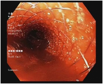 Antimicrobials were escalated empirically. Upper GI endoscopy revealed diffuse mucosal oozing from the lower end of esophagus along with small isolated gastric varix. Glue injection was done, however patient continued to bleed despite supportive measures. Repeat UGI scopy was done, which showed continued generalized ooze from lower end of esophagus. Therefore endoscopic guided Ella danis SEMS was placed with upper end at 25 cm from GE junction. The patient was stabilized and moved to the intensive care unit. There was no subsequent evidence of upper GI bleed. Patient however continued to deteriorate due to pulmonary sepsis. He later succumbed and expired on POD 22 (Figure 1) (Figure 2).