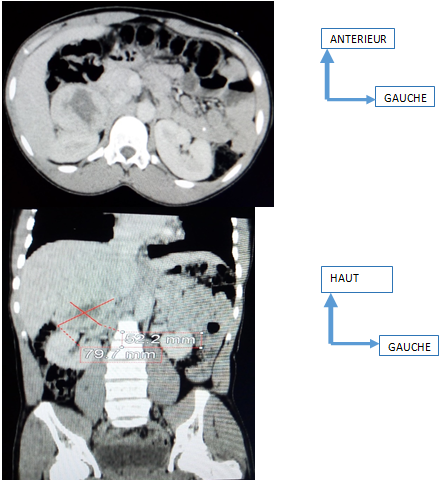 Abdominal ultrasound performed using the 3.5 Mhz convex probe showed a well-limited right adrenal mass, with regular contours, heterogeneous echostructure 79 mm long axis, with a necrotic center, with hyper vascularization on color Doppler of the fleshy portion. It was in close contact with the right upper renal pole. The abdominal CT examination (Figure 1) carried out following the ultrasound also shows the right adrenal mass with a necrotic center measuring 79.7 x 52.2 mm, the spontaneous density of the tissue portion of which is measured at 35 UH, the density at portal time at 75 HU and density at 10 min after intravenous injection of contrast product at 52 HU. Thus the relative and absolute “Wash out” is evaluated at 6% and 39%. There was no intraperitoneal or extraperitoneal fluid effusion, no infiltration of peritoneal fat and no lumbo-aortic, coelio-mesenteric or pelvic ADP.