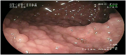 DLNH is a rare benign condition of unknown etiology that may occur in any age group.1 It usually regresses in children and it was thought to be associated with delayed type of food hypersensitivity. In adults, it’s usually associated with immunodeficiency syndromes e.g. Selective IgA deficiency syndrome and Common variable immunodeficiency.2 DNLH is lymphoproliferative disease that is characterized by a stimulation of the B cell compartment of the lymphoid follicles that results in abnormal proliferation of these follicles.2–7 Many theories had been implemented for the underlying pathogenesis. One of the theories is the stimulation of a local immune reaction in response to certain antigens in the GIT, but yet no antigen has been identified. Another theory that it may be related to plasma cell precursors due to a maturational defect in the development of B-lymphocytes in order to compensate for functionally inadequate GITtissue.3–7