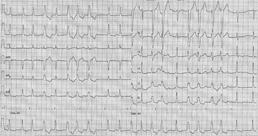 Figure 1 Atrial fibrillation with irregular irregularity of the narrow and wide QRS complexes, the latter occurring as singlets, doublets, and short runs.