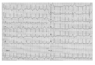 A 84-year-old woman was admitted to inpatient rehabilitation having suffered eight days before a stroke. CT revealed a large infarction in the right cerebral hemisphere. CT angiography showed cutoff of the right mid cerebral artery. Because of the patient's late arrival to hospital thrombolytic and endovascular treatment were not implemented. Oral aspirin was started. Relevant in the patient’s medical history were arterial hypertension, dyslipidemia, and mild cognitive impairment. At the time of her transfer to our institution she was alert, her brachial blood pressure while sitting was 122/81 mmHg, the pulse 84 bpm, pulse deficit 15 bpm, and SpO2 93% in the ambient air. There was flaccid paralysis of her left arm and left leg. Results of routine laboratory tests were within the normal range: serum sodium 142 mEq/L, potassium 4.5 mEq/L, LDL-cholesterol 58 mg/Dl, HDL-cholesterol 40 mg/Dl, creatinine 0.77 mg/Dl. The ECG showed AF, previously not diagnosed, with interspersed narrow QRS complexes and wide QRS complexes (Figures 1&2). The patient's usual medications were continued, including atorvastatin 80 mg, lercanidipine 10 mg, ramipril 5 mg and famotidine 20 mg, with aspirin 100 mg added, and later atenolol 25 mg and apixaban 5 mg b.i.d.