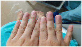 Upon admission, neurologically integrated, generalized pallor of skin and integuments, hydrated oral mucosa, both hemithorax with audible vesicular murmur without aggregates, heart sounds, goo. Holosystolic murmur intensity grade V in the pulmonary focus predominantly. Palpation globose abdomen with pregnant uterus fundus 28cm, cephalic presentation, longitudinal situation, left dorsum, FCF 140x, posterior cervical, vaginal touch closed, length cervical 3cm, full limbs, symmetrical, distal acrocyanosis, fingers on drumsticks. (Figure 1). Oxigen saturation 92%, no edema, pulses without alterations capillary, refill 2 seconds. Upon admission laboratories and cabinet, clinical labs with the following result.