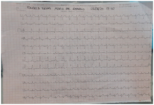 Acid-base balance without apparent complications ph: 7.41, pO2 43, pCO2 31, HCO3: 19, laboratories (Table 1), Tele chest (figure 2), electrocardiogram (figure 3), echocardiogram (figure 4). The abdominal route is interrupted under epidural anesthesia. Pregnancy with the following findings obtaining on 04-03-2020 at 11:29 hrs. R.N. female weight 2120g, size 44cm. APGAR 5/7, Capurro 34 SDG. After a surgical event, she admits to the ICU as multidisciplinary management; oxygen supplementation starts, and the latter prophylactic low-molecular-weight heparin, after four days of ICU treatment with favorable evolution, is admitted to the gynecology floor to begin cardiac rehabilitation and continuous monitoring, thus progressing correct deciding discharge from the service.