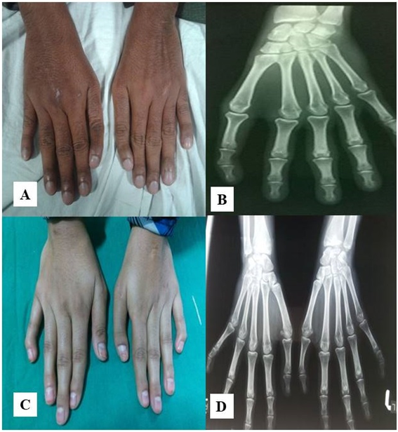 Figure 2 Photographs of the dorsum of both hands of the patient (A) showing triphalangeal thumb, pandigital clubbing and clinodactyly. (B) The X-ray of the hand of the same patient showing triphalangeal thumb is shown in B. The photo (C) is dorsum of both hands of his sister showing clinodactyly. (D) The x-ray of both hands with wrist bones are shown in photo D.