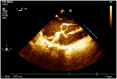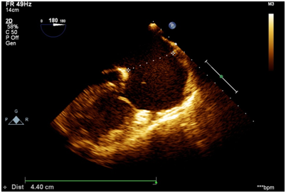 The 2D-Echo showed ostium secundum atrial septal defect of size 4.4cm with a bidirectional shunt. RA and RV dilated. This was confirmed by TEE. (Figure 3)