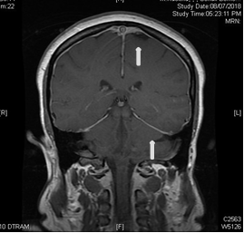 She had MRI brain and C spine with contrast, (Figure 1) a lumbar puncture after imaging, intravenous pain medication, dexamethasone per os, and was positioned supinely. Her brain MRI and C spine showed signs of low intracranial pressure with DME; see in Figure 2. She initially had a traumatic and dry LP with Glucose 5.68, raised protein of 3672 mg, 54000 red cells, 43 white cells and xanthochromia was positive.
