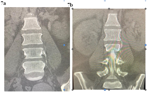 Figure 7a & 7b Myelogram: Extravasation of contrast into the paravertebral soft tissue around the left lumbar 2/3 Tarlov cyst suggesting a CSF leak at this level.