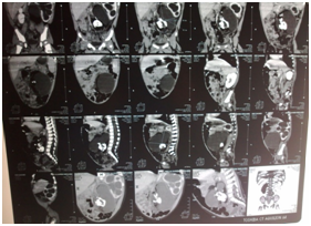 A 3 month-old male infant was admitted to our hospital with abdominal mass. He is issued from a non-well controlled pregnancy. The mother had only two ultrasonographic exams in the first trimester of gestation which shew a twin pregnancy and in the third trimester had underwent another one which detected a monofetal pregnancy.