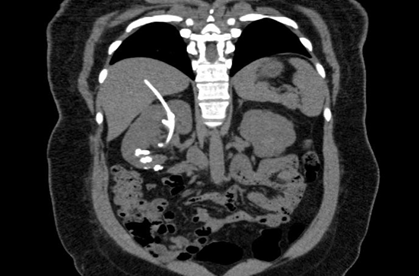 A 45-year-old female with systemic arterial hypertension (SAH) reported recurrent urinary tract infections (UTIs), averaging two episodes per year since adolescence. At age 16 (1997), she was diagnosed with nephrolithiasis in the right kidney and underwent open anatrophic nephrolithotomy. In 2009, she underwent PCNL for stone removal but lost follow-up. In 2018, an abdominal MRI performed for unrelated gastrointestinal symptoms incidentally revealed a catheter in the right kidney, likely retained from previous percutaneous surgery. No immediate intervention was undertaken at that time.