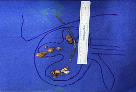 Retained surgical foreign bodies, including catheters, are rare but significant complications following urological procedures, with an estimated incidence of 0.1-0.2% in abdominal surgeries.1 These foreign bodies can contribute to chronic infections, stone formation, and organ damage, particularly in patients with pre-existing nephrolithiasis. The presence of a retained foreign object may serve as a nidus for stone development, exacerbating conditions like urinary tract infections and pyelonephritis.2 This report describes a complex case involving a 45-year-old female with a forgotten PCNL dilation catheter transfixing the liver and right kidney, underscoring the necessity of intraoperative material counting and diligent postoperative monitoring.