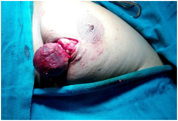 Kihara et al reported a rare case of giant breast cyst with diameter of 15 cm containing an intracystic papilloma. The small breast cyst due to intracystic papilloma are frequent but giant breast cyst due to intracystic papilloma are very uncommon. Imaging of breast suggested possibility of malignancy. Aspiration of fluid from the cyst did not reveal any malignant cells, neither repeated aspiration resulted in cure of breast cyst. The excision of cyst was done and histopathological examination revealed two benign intracysticpapillomas. They recommended that excision of the cyst should be done as treatment and confirmation of diagnosis by histopathological examination as preoperative diagnosis by imaging and cytology are not reliable to differentiate between intracystic papilloma and intracystic papillary carcinoma.16 In patients of breast cyst, when radiological and fine needle aspiration cytology findings are mismatched, an excision biopsy is recommended.17 Giant breast which are diagnosed as simple cyst on ultrasound, mammography and fine aspiration cytology must be excised and subjected to histopathological examination to rule out malignancy.