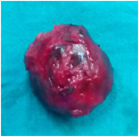For tissue diagnosis of this swelling fine needle aspiration was done which confirmed the diagnosis of simple breast cyst as no malignant cells were seen (Figure 2). After routine hematological and biochemical investigations were done, the preanesthetic checkup was done. The patient was graded as ASA I and fit for anesthesia. The patient was operated under general anesthesia. A radial incision was used for excision of this giant breast cyst. The cyst was excised in to (Figure 3). The wound was closed in layers over mini-suction drain and dressed. The wound healed well and skin clips were removed on 9th postoperative day. The excised specimen was sent for histopathological which confirmed it to be simple mammary cyst with no evidence of malignancy (Figure 4).