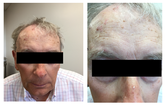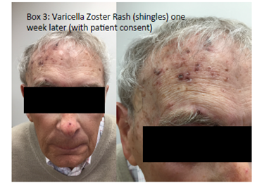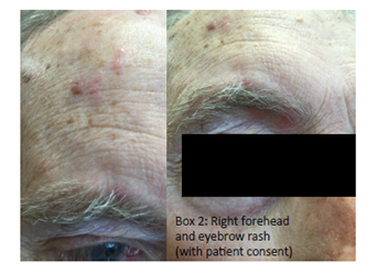 Careful inspection of the skin showed mild raised papular rash on the right forehead and above the right eyebrow (Figure 2, with patient consent). The rash was swabbed. Both swabs from the forehead and near the eyebrow tested positive for varicella zoster virus on polymerase chain reaction. The zoster rash became more obvious a week later (Figure 3).