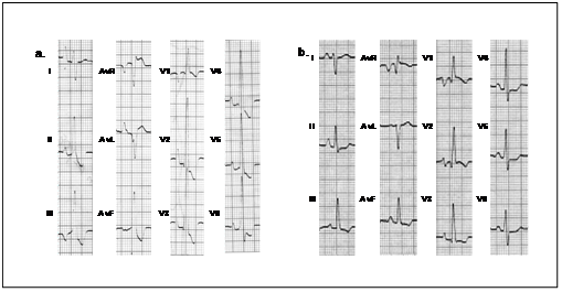 Patient 2 is a 47-year-old woman who received a diagnosis of iPAH in 1999 after progressive dyspnoea and reduction of the exercise capacity in the last 2years and syncope in the last months. At first evaluation at our centre, the patient was in NYHA/WHO functional class III and had jugular distension, hepatomegaly and peripheral oedema. The 6MWD revealed a marked reduction of effort capacity (270m), ECG showed RV strain Figure 2A, echocardiography showed marked right heart dilatation with severe RV free wall hypokinesis (TAPSE 12mm) (Table 1). The RHC revealed a severe pulmonary hypertension (mPAP 57mmHg, WP 3mmHg, CI 2.2l/min/m2, PVR 16.4WU), with no response to the acute vasoreactivity test (iNO, 20ppm) (Figure 2). Thus, she was started on bosentan 62.5mg bid, increased to 125mg bid after 4weeks. In the first 10months the patient had an improvement in NYHA/WHO functional class (from III to II), in effort tolerance (from 270m at baseline to 360m after 3months of treatment) and a regression of systemic congestion. At that time RHC confirmed ahemodynamic improvement. During the following year, she had a new reduction of exercise capacity and returned to III NYHA/WHO functional class. A RHC, performed after 2years of treatment, showed a deterioration of pulmonary hemodynamics (mPAP 50mmHg, CI 2.4l/min/m2, PVR 12.8WU) (Figure 3).
