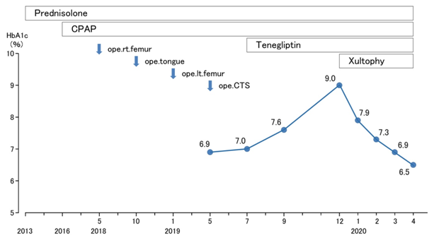 In summary, this case seemed to be impressive from several points of view. They include asthma and COPD, CPAP therapy, tongue cancer, arteriosclerosis, bone complications, CTS and administration of Xultophy®. Many years of steroid administration may be influenced the progress. We hope that this report will serve as a reference for future diabetes practice.