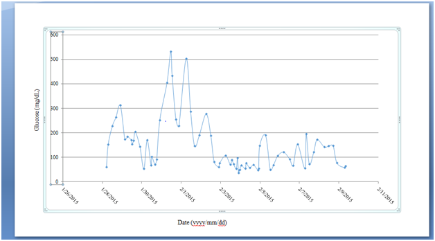The blood glucose levels still fluctuated significantly (up to >500 and down to <20mg/dl) and were difficult to control after the event (Figure 1). We checked free form insulin autoantibody (IAA)by using immunoradiometric assay(free anti-insulin-antibody radio immuno assay kit, Cisbio Bioassays)on January 29, 2015, which was positive (20.9%, normal <5.5%). Both the glutamic acid decarboxylase (GAD) and islet (IA-2) auto antibodies were negative (0.22 and 0.35 U/ml, normal <1U/ml respectively). We simultaneously carried out the following laboratory tests, the venous plasma glucose was 50mg/dl, the serum C-peptide was <0.1ng/ml (0.9-7.1), and the insulin was 45.7μIU/mL (5-20) using Immulite® 2000 (Siemens Healthcare Diagnostics);the test results were compatible with the diagnosis of insulin antibody-related autoimmune hypoglycemia.