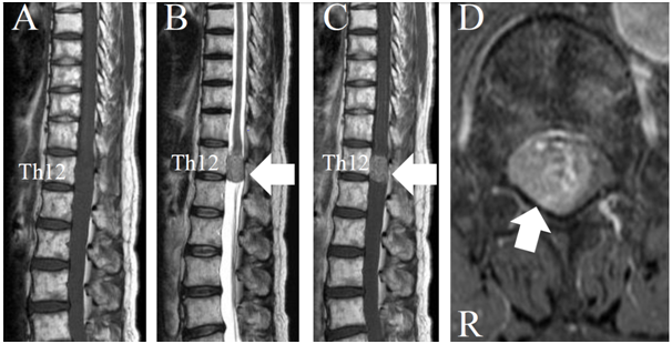 Preoperative sagittal magnetic resonance imaging (MRI) showed that the tumor was located in the dura mater at Th12 (Figure 2A–C). Compared with the spinal cord, the tumor had an iso-intensity signal in a T1-weighted MRI and high-intensity signal in a T2-weighted MRI (Figure 2A) (Figure 2B). The tumor was enhanced by Gadolinium with diethlenetriaminepentacetate (Gd-DTPA) (Figure 2C) (Figure 2D). The spinal nerve roots were compressed by the tumor, as observed on an enhanced T1-weighted axial image with Gd-DTPA (Figure 2D). The patient was diagnosed as having an intradural-extramedullary tumor and tumor resection surgery was performed to decompress the nerves.