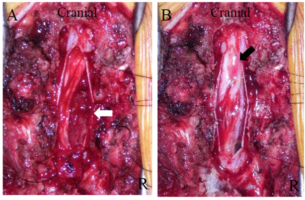 The thoracic spine was explored through a straight posterior midline approach. A laminectomy at Th12 revealed no extradural tumor. The dura mater and arachnoid membrane were exposed and the spinal nerve roots and conus medullaris were compressed by the tumor (Figure 3A). We scraped out and removed the tumor after which the spinal nerve roots and conus medullaris were decompressed (Figure 3B).