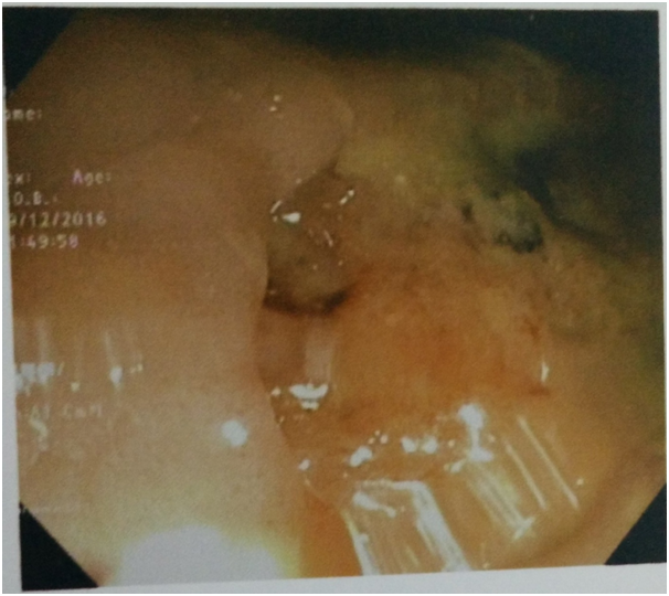 The investigations showed Hb-12.1gm/dl, ESR-45mm 1st hour, total leucocyte count-8700/mm3, differential leukocyte count: neutrophil(63%), lymphocytes(27%), eosinophils(5%), monocytes(4%), and basophils(1%). Biochemical investigations showed Fasting blood glucose-98.0mg/dl, blood urea-30.8mg/dl, serum creatinine-1.1mg/dl, serum bilirubin-0.8mg/dl, AST-34.0 IU/L, ALT-32.3IU/L, Alkaline phosphatase-100.8IU/L. Viral markers for HIV, HBSAg, and HCV was found to be negative. Radiography of Chest showed left sided pleural effusion. Radiography of thoracolumbar spine did not show any abnormality. Fistulo gram delineated the tract which was directed upwards posteromedialy. Fine needle aspiration cytology (FNAC) of right inguinal lymph node showed granular necrotic material with few lymphocytes highly suspicious of tuberculosis. MRI of thoracic spine (T2WI) showed a nodular hyperintense intramedullary lesion at T4 vertebral segment with surrounding hyperintense edema extending from T2to T6 vertebral level (Figure 1). With T1 contrast isointense lesion at D4 vertebral segment showed thick ring enhancement. Colonoscopy also showed a large ulcer in the lower part of rectum suggestive of Tuberculosis (Figure 2). The histology of biopsy material taken from perianal lesion showed caseating necrosis, epithelioid cells with Langhan’s type multinucleated giant cells suggestive of Tuberculosis (Figure 3).