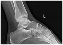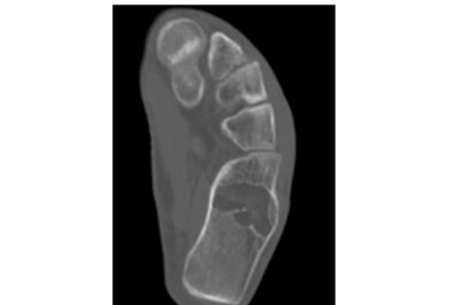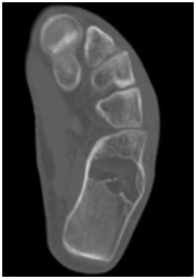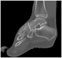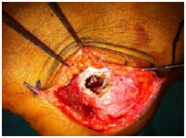 Twenty four year old male presented to us with left heel pain for nine weeks of duration. The onset of the pain was insidious and aggravated by weight bearing and prolonged standing. It was relieved with the use of analgesics and limb rest. There was no history of preceding trauma or rest pain. On examination there was no local swelling and skin changes. Deep tenderness was present over anteromedial aspect of calcaneum. Plain radiographs of the heel revealed well defined, lytic lesion in the calcaneum. Computed Tomographic scan of the same showed lytic lesion in the in the body of calcaneum just below the posterior facet. Provisional diagnosis of benign bone tumor was made and patient was planned for curettage and bone grafting.