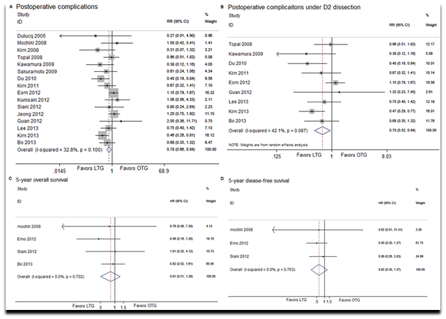 Gastric cancer remains the fifth cause of related cancer death. The objective of the cure is to obtain Ro resection with negative margins to have the best prognosis. Surgical option remains the only curative choice for this disease. Open Gastrectomy was the only type of technique available until 1991 when Kitano performed the first LG followed by Goh in 1992.14–15 Since then, the laparoscopic technique has gained large consensus and several authors have reported successful results regarding laparoscopic subtotal or total gastrectomy for cancer. They demonstrated that LSG/LTG are feasible and safe techniques with important peri-operative advantages such as fewer use of analgesics; less blood loss, due to major field amplification; less acute lung injury (ALI) volume overload and less hypothermia. In addition to this, they also showed better LND, faster oral intake, reduced pain, earlier hospital discharge, the same M/M and similar anastomotic leakage or stenosis, and similar LTS-DFS-OS compared to OG. As far as port site some Author has reported negative results10–14 while other authors have noticed that the time is shorter and closer to open technique when a dedicated laparoscopic team perform at least 50 LG.4,5 Recently, Haverkamp et al. meta-analysis have showed the superiority of LG vs OG but oncological outcomes are still being debated.2,11 According to Japanese Guidelines, distal or total gastrectomy with D2 dissection improve survival. The review reported that LSG or LTG plus D2 LND is feasible and safe in the hands of experienced surgeons. With the development of the laparoscopic technique, the number of LTG use is increasing, and seven additional articles comparing the LTG to OTG have been published. There was a longer duration of operative time in the LTG group than that in the OTG group (WMD, 47.00; 95% CI, 31.67, 62.33; P, 0.001). Blood loss during the operation was decreased under the laparoscopic procedure (WMD, 2179.60; 95% CI, 2251.80, 2107.89; P, 0.001). No statistical difference was found between the two groups in the number of harvested lymph nodes (WMD, 2.33; 95% CI, 20.04, 4.71; P=0.054). The length of the proximal resection margin was similar for either groups (WMD, 0.06; 95% CI, 20.26, 0.39; P=0.706). In the subcategory analysis of postoperative complications, patients in the LTG group have showed less wound infection (RR, 0.35; 95% CI, 0.20, 0.61; P, 0.001). No statistical differences were found in anastomotic leakage, anastomotic stenosis, postoperative ileus, pneumonia, pancreatitis, intra-abdominal abscess. There were no significant differences in hospital mortality. DFS in LTG was similar to that in OTG (HR, 0.62; 95% CI, 0.30, 1.27; P=0.191) (Figure 2-3).1–3,12–20