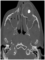 Panoramic Radiographic was obtained shows a large unilocular radiolucency on the left side of the maxilla, extending from tooth #22 to #26. Unerupted tooth #23 was present inside the lesion. Computed Tomography (Figure 2) (Figure 3) of facial bone was obtained shows well circumscribed unilocular radiolucency and radiolucency involves the crown of unerupted tooth #23. Based on the history and clinical features and radiographic evaluation dentigerous cyst and adenomatoid odontogenic tumour was made as provisional diagnosis. Other strictly radiolucent lesions worthy of consideration are keratocystic odontogenic tumor, ameloblastic fibroma, odontogenic myxoma, or central giant cell tumour as well as unicystic ameloblastoma which is common in this age.