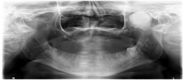 A 69-year-old male patient referred to the radiology clinic of the Atatürk University with complaint limitation of mouth opening, with no evidence of pain or joint sound. There was no history of facial trauma and medical history was not significant. In clinical examination, limitation of mouth opening and deviation to the left side during the mouth openning was found in patient. Figure 1 Panoramic radiography showed expanded irregularly shaped radiopaque lesion on the left coronoid process. Figure 2 CBCT scan was performed. Three-dimensional (3D) reconstruction of the CBCT images showed a mushroomshaped hyperplastic enlargement of the coronoid process which causesresorption under the bones of the skull base. Figure 3 The size of the lesion was measured 33,1x25,5x30,2mm. Patient was referrred to the surgery clinic with the prediagnosis of osteochondroma.
