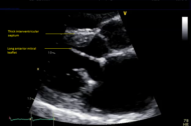 Video 1 Transthoracic echocardiogram at baseline showing long anterior mitral leaflet and moderately thickened interventricular septum.