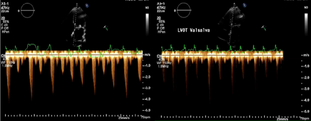 Figure 2 Respirophasic changes in LVOT velocity (panel A) and increased gradient with Valsalva (panel B) showing peak velocity of 4.5m/s.