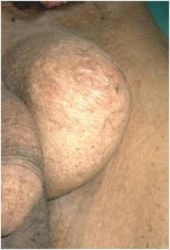 An 82year old male presented with painless swelling of right groin of 18months duration for which he was asymptomatic. General physical as well as systemic examination was normal. Local examination showed a 17×11×7.3 centimeter swelling, with thinned overlying skin, soft, non tender, with restricted mobility, having negative cough impulse and the transillumination test (Figure 1). Ultrasonography showed a hyper echoic lesin. Fine needle aspiration yielded adiposities. Patient had excision with intraoperative swelling, soft, yellowish with adhesions with adjacent structures which were easily released, weighing about 756grams (Figure 2) (Figure 3). Post operative period period was uneventful and no recurrence seen in follows up of 11months.