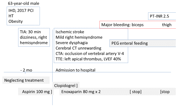 A 63-year-old male, working as a computer technician, with a long history of arterial hypertension, ischemic heart disease, dyslipidemia, was active and hard working until recently. He had neglected to present on medical follow-up and was taking his medications irregularly. Two months after a recent transient ischemic attack he presented to hospital with dizziness, vomiting and numbness in the right arm and right leg. CT angiography revealed complete obstruction of the left vertebral artery, segment 4, which was inappropriate for endovascular treatment. The electrocardiogram showed atrial fibrillation and poor progression of r waves in precordial leads V1-V4. Transthoracic echocardiography revealed apical akinesia, LVEF 40% and an apical left ventricular mural thrombus. Enoxaparin treatment was started 1mg/kg body weight b.i.d. After the initial surge of the blood pressure, measurements returned to normal, and antihypertensive medications were discontinued. Atorvastatin 80mg/day was instituted. In diagnosing severe oropharyngeal dysphagia which precluded oral intake, enteral feeding was instituted with Osmolite® 1400mL/day.