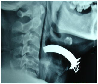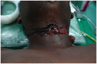 Traumatic airway injuries are fortunately rare. Though injuries can be obvious and initial management straightforward, the diagnosis can be difficult. Laryngeal trauma could either be a blunt trauma or a penetrating injury. It has been reported in US that less than 1 percent of all trauma involves the larynx.7 In the United States, the incidence of both forms of injury in the 1980s ranged from one in 5,000 emergency visits8 and one in 30,000 emergency visits in the 1990s.5 Concurrent injury to the pharynx and/or esophagus is infrequent in both penetrating and blunt laryngeal trauma.9 The most common finding in these patients has been dysphonia and pain/tenderness of the larynx.5 CT imaging is beneficial in patients with a significant history of blunt force trauma to the anterior neck with or without significant abnormal findings on physical examination, particularly with dysphonia or hemoptysis, and if the condition and continuity of the endolarynx and trachea is not observable due to edema or hematoma.3 Video stroboscopic laryngoscopy provides an excellent assessment of vocal fold mobility and integrity, and potential reversibility of injuries.10 Stroboscopic examination is also useful for the assessment of recovery. The timing of early surgical management ranges from within 24hours to several days. However it has been reported by Herbert Harris in 1965 and 1970 that surgery is beneficial within 24hours of injury11,12 Following acute airway management, laryngeal injuries are managed based on the severity of injury and specific elements of each lesion. A classification and treatment protocol has been described by Schaefer5 Group I laryngeal traumas demonstrate only minor laryngeal edema or lacerations. Typically, this group can be treated with steroids, antibiotics, antireflux therapy, close observation. Group II includes more demonstrative edema or hematomas without exposed cartilage. Diagnostic endoscopy and tracheostomy are frequently indicated for this group. Group III laryngeal traumas demonstrate massive edema or large mucosal lacerations. Conservative management includes anti inflammatory, anti relux, antibiotics and corticosteroids. Surgical management includes tracheostomy, direct laryngoscopy and oesophagoscopy open operative interventions and laryngeal stents (Figures 3-7).