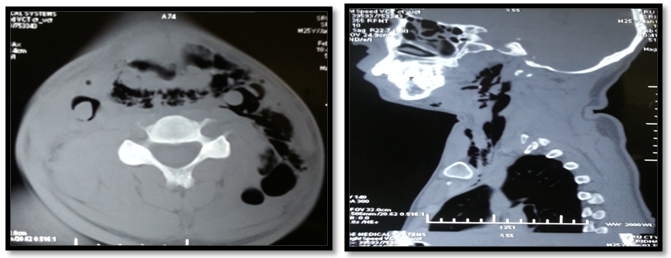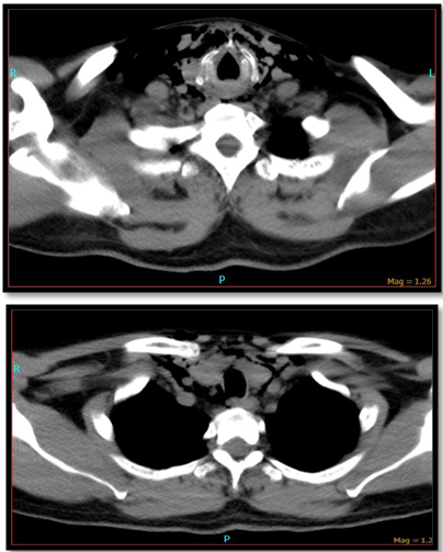 The second patient is a 58year male who came to the emergency room with alleged history of RTA following which he developed difficulty in swallowing and spitting out blood stained sputum. Examination revealed subcutaneous emphysema and tenderness over the laryngeal frame work. CT-neck plain showed extensive emphysema of neck with extension into the superior mediastinum (Figure 1) and fracture of thyroid cartilage at the midline with mild lateral displacement of the right side ala (Figure 2). He was admitted in the intensive care unit and was monitored for 24hours after which tracheostomy followed by neck exploration and laryngeal stabilization under general anesthesia was performed where in the fragmented thyroid cartilages were sutured. He was on ryles tube feed for 2months following which he was decannulated and ryles tube was removed.