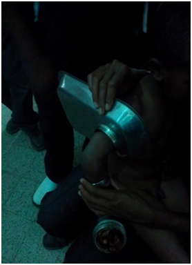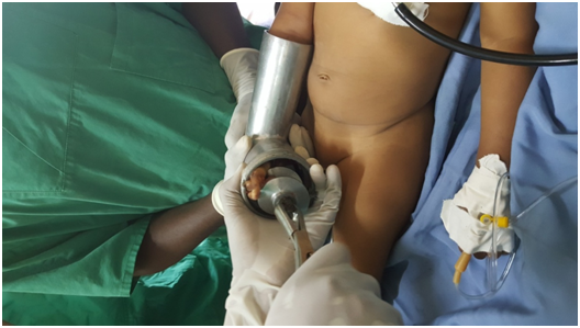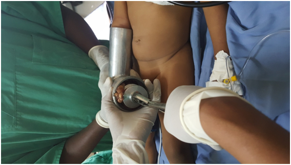 A 2-year-old female child presented by her family on September 13, 2015 30minutes after her hand was caught by meat grinder. She inserted her right hand suddenly while it was working. Her family turned off and brought her while the hand was still inside the grinder. Figure 3 She was taken immediately to the operation theater and under general anesthesia; the grinder was reversed with a Rongeur until the hand was released. Figure 4–6 The 2nd to 5th fingers were severely crashed, fractured bone fixation and wound approximation together with antibiotics and analgesics tried but after 9days the digits became gangrenous and for which we did amputation. The 1st finger was good.